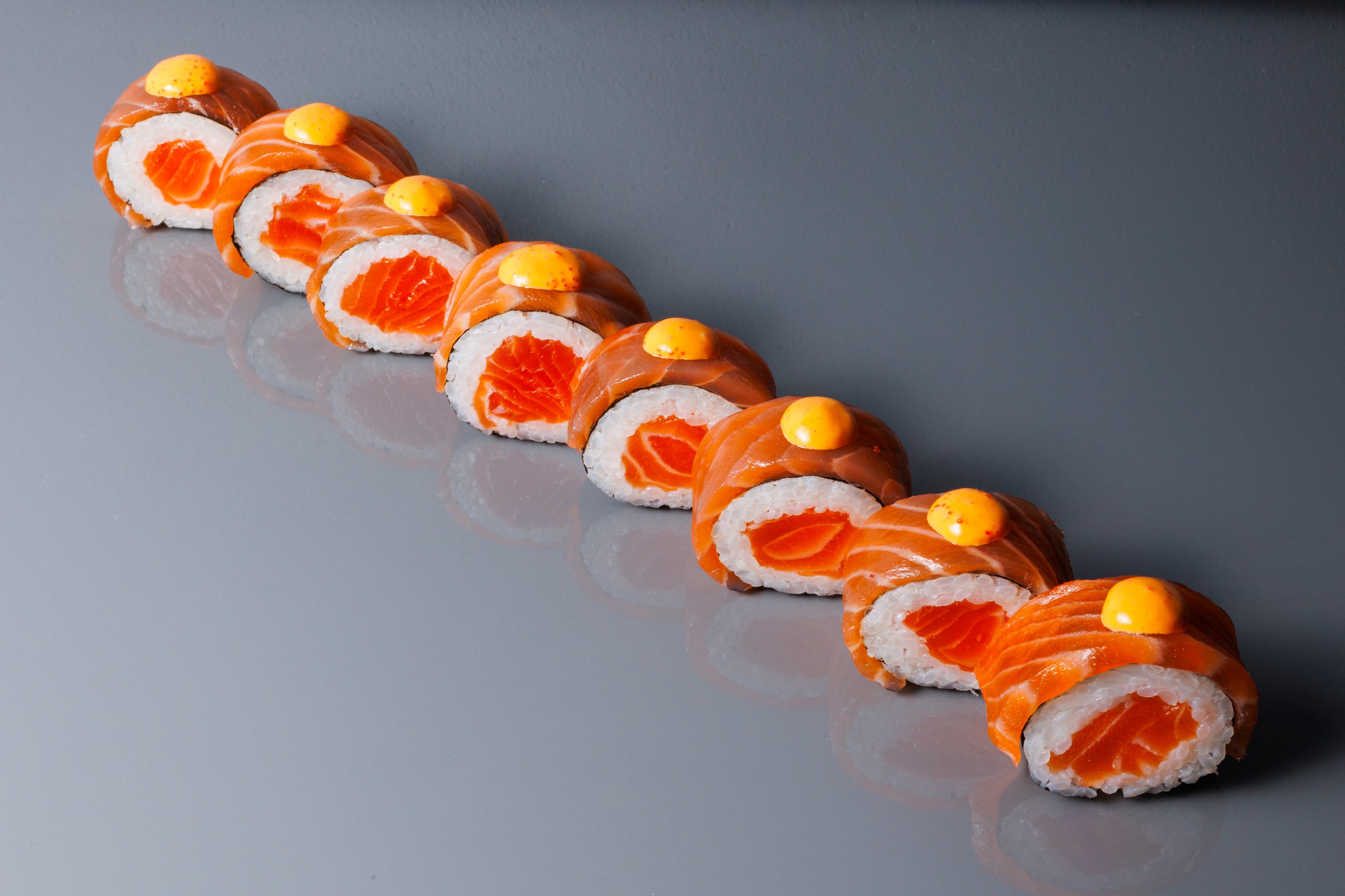Состав: Нори, рис для суши, лосось слабосолёный снаружи и внутри, спайси соус.