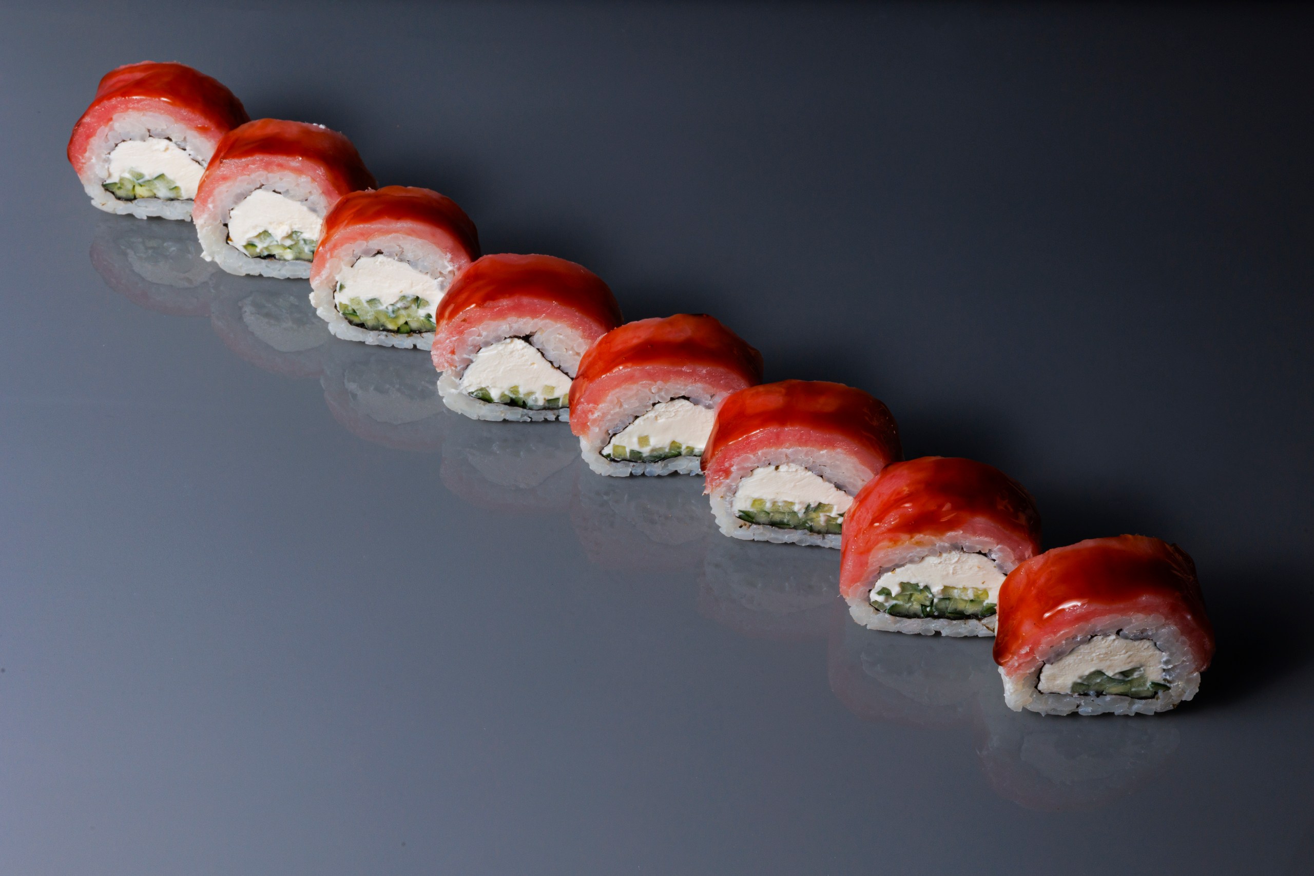 Состав: рис для суши, водоросли нори, сыр творожный, тунец, огурец