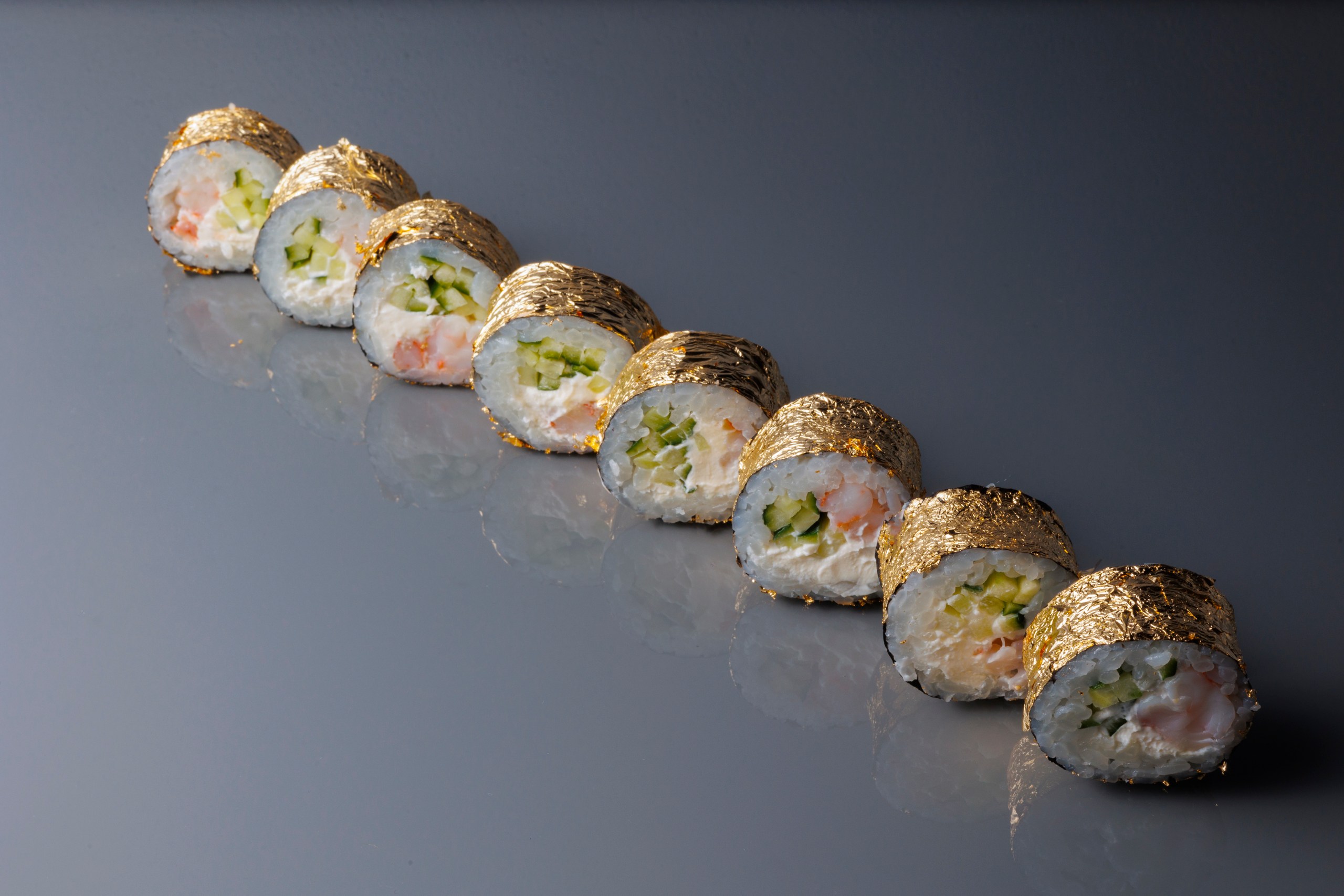 Состав: Нори, рис для суши, сыр творожный, огурец, креветка тигровая, золото сусальное.