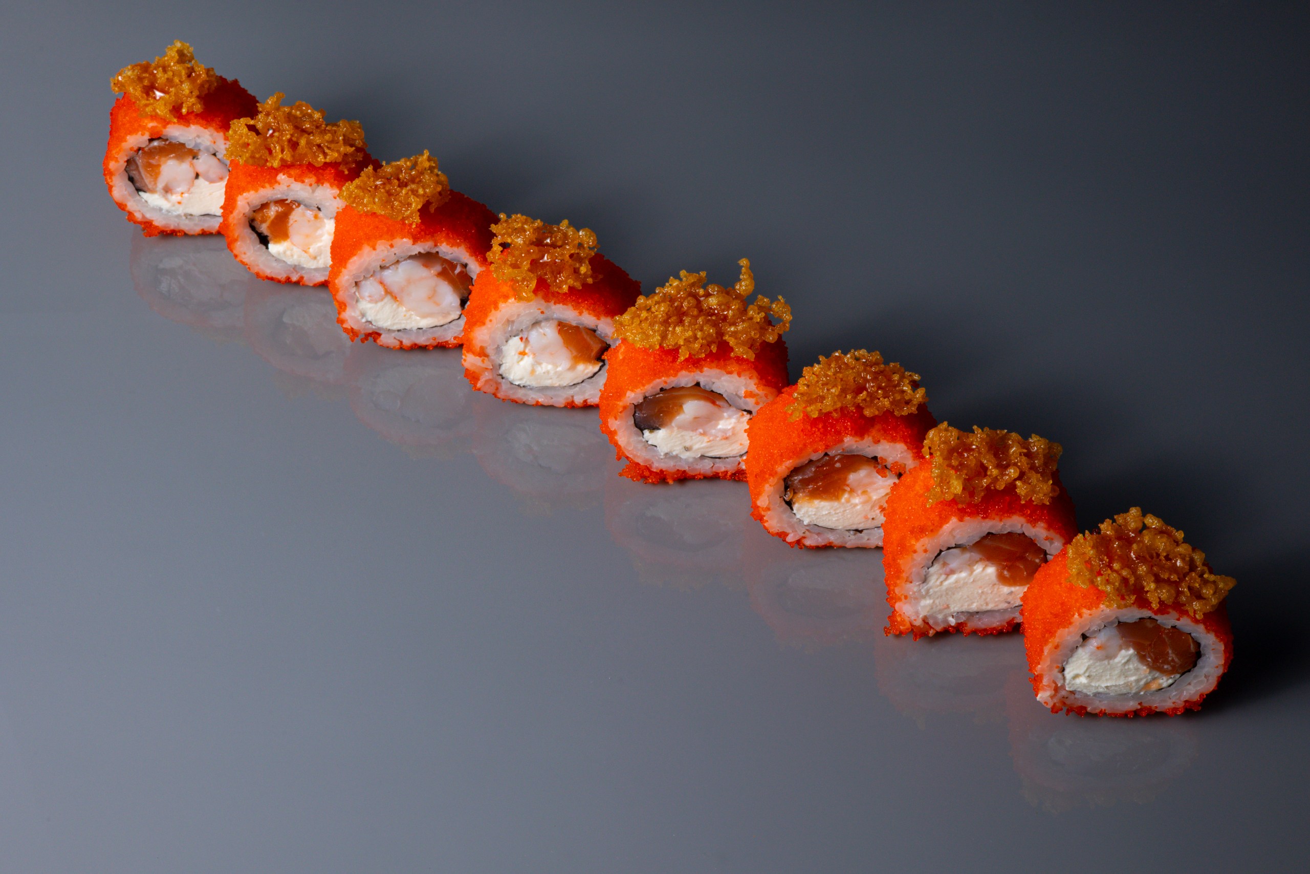Состав: рис для суши, икра масаго, нори, сыр творожный, лосось слабосолёный, креветка тигровая, кранч-темпура.