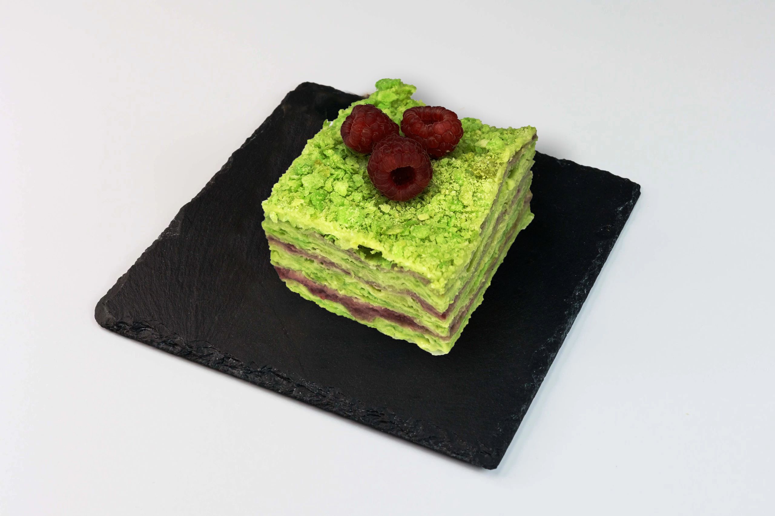 Состав: заварной крем, коржи запечённые, фисташковая паста, малина.
