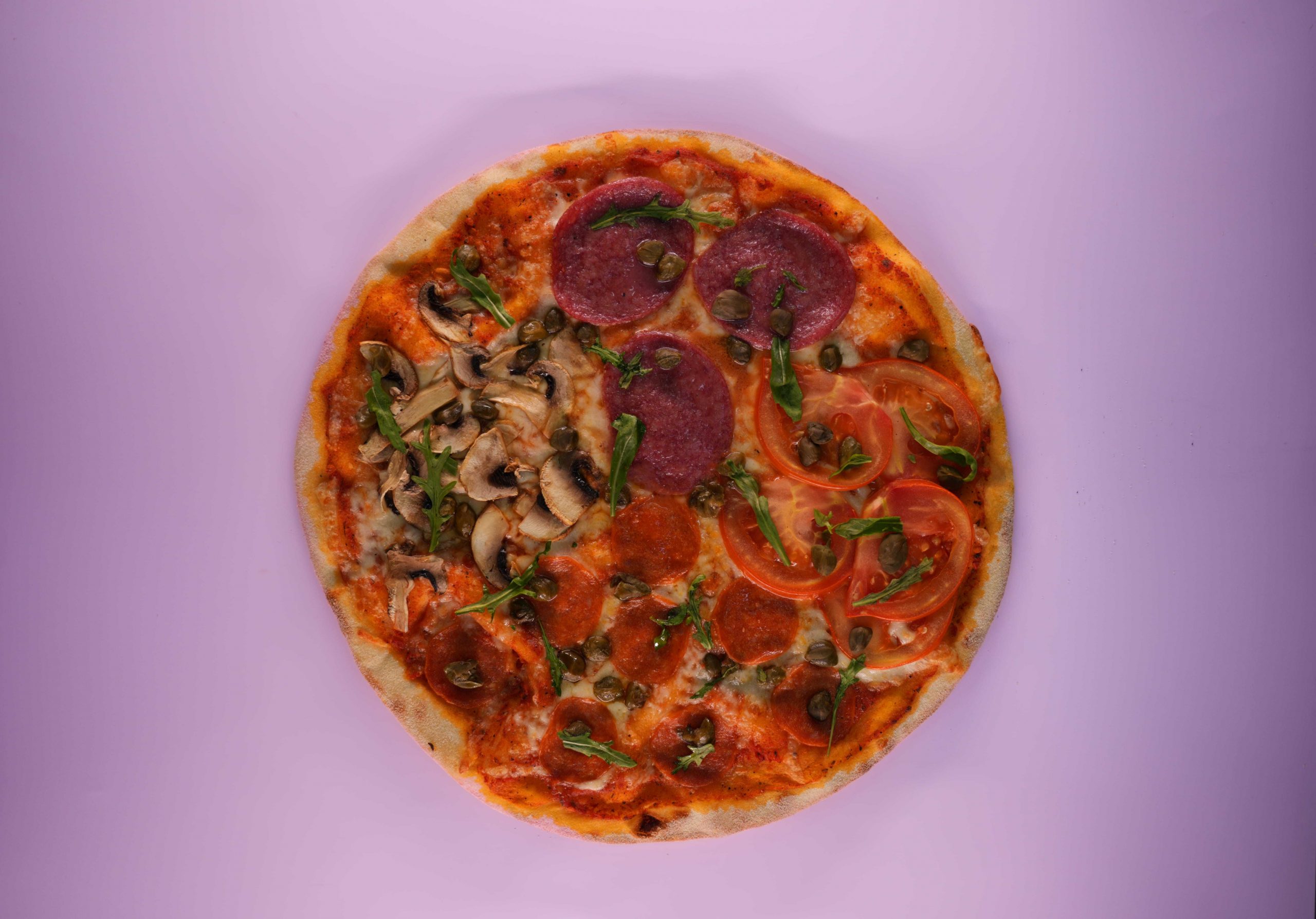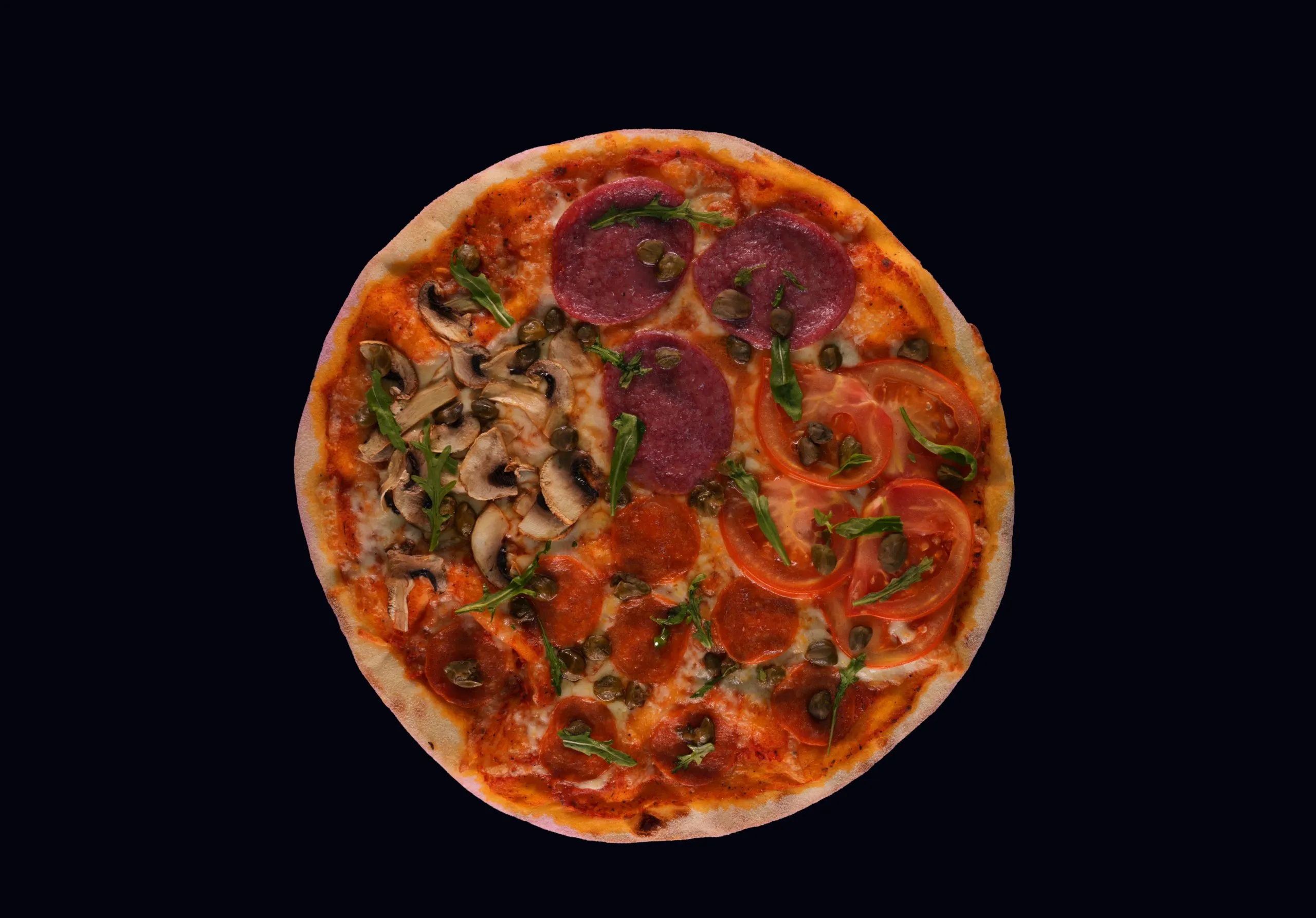 Описание: тесто, соус томатный, сыр моцарелла, грибы, пепперони, помидор, салями, каперсы, руккола