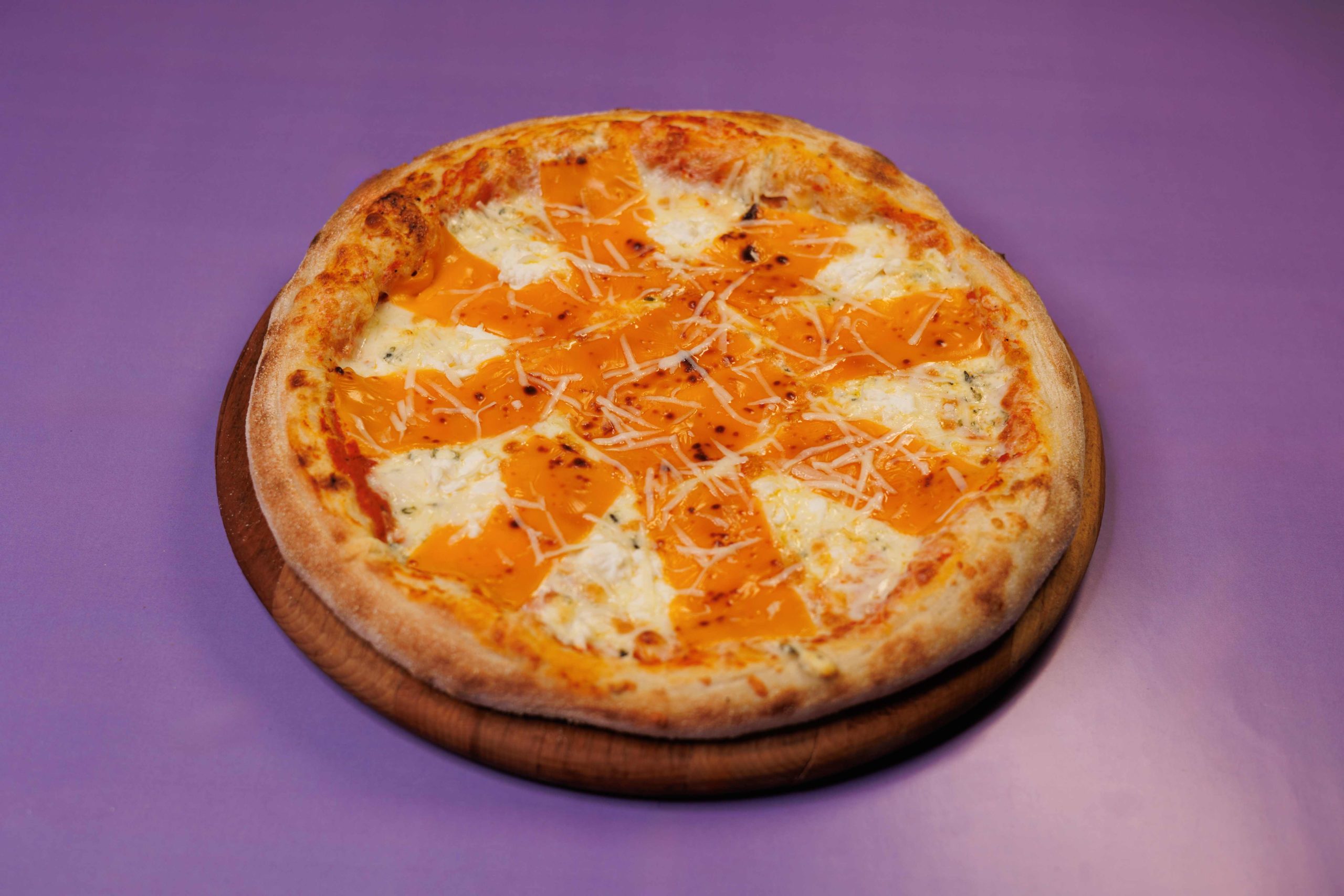 Состав: сыр чеддер, сыр дорблю, сыр пармезан, сыр моцарелла, томатный соус, воздушное тесто.