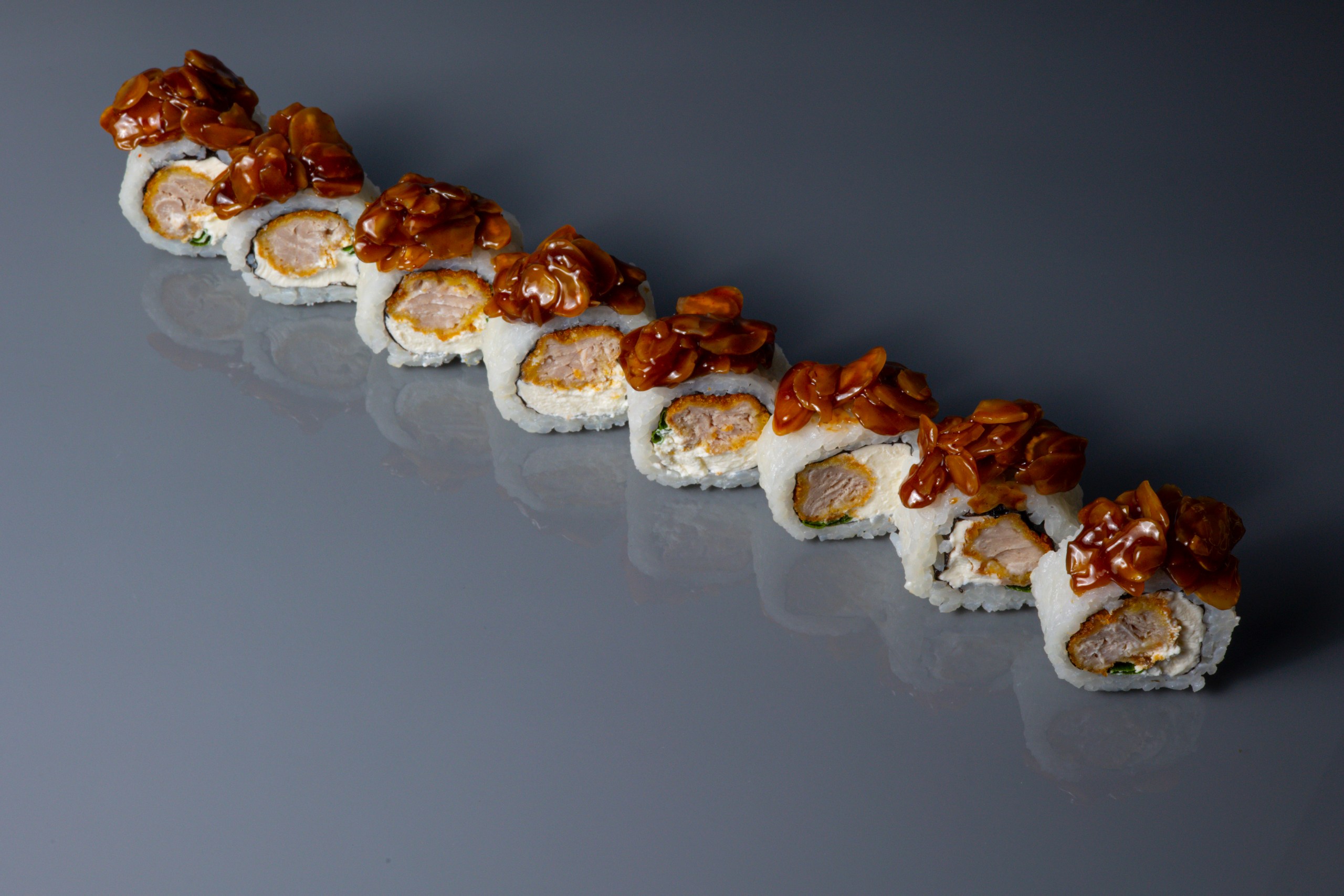 Состав: Рис для суши, нори, сыр творжный, темпура-тунец, миндаль, соус унаги-шрирача.