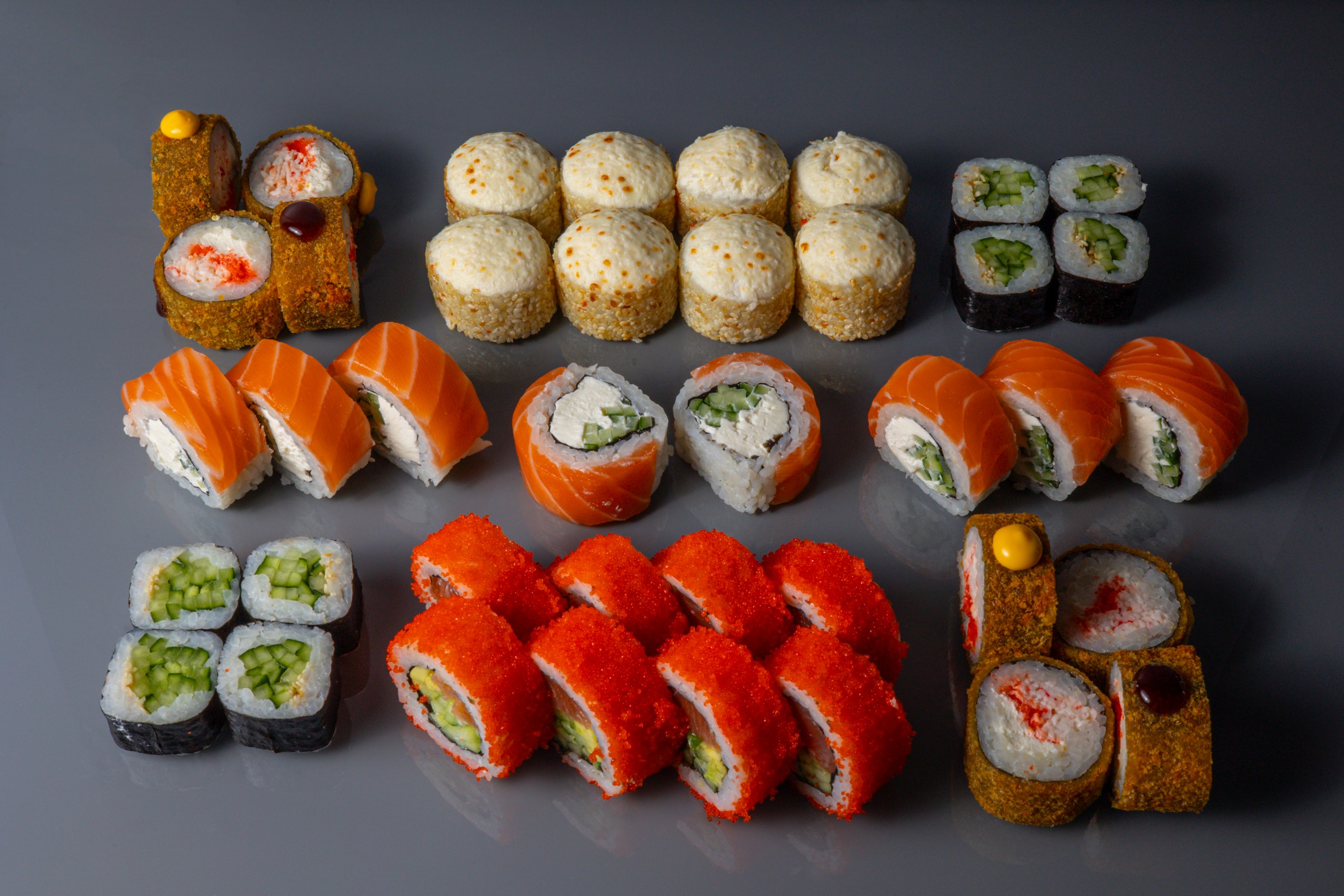 В составе сета: Филадельфия с огурцом, калифорния с лососем, темпура с крабом, запеченный с креветкой, маки с огурцом.