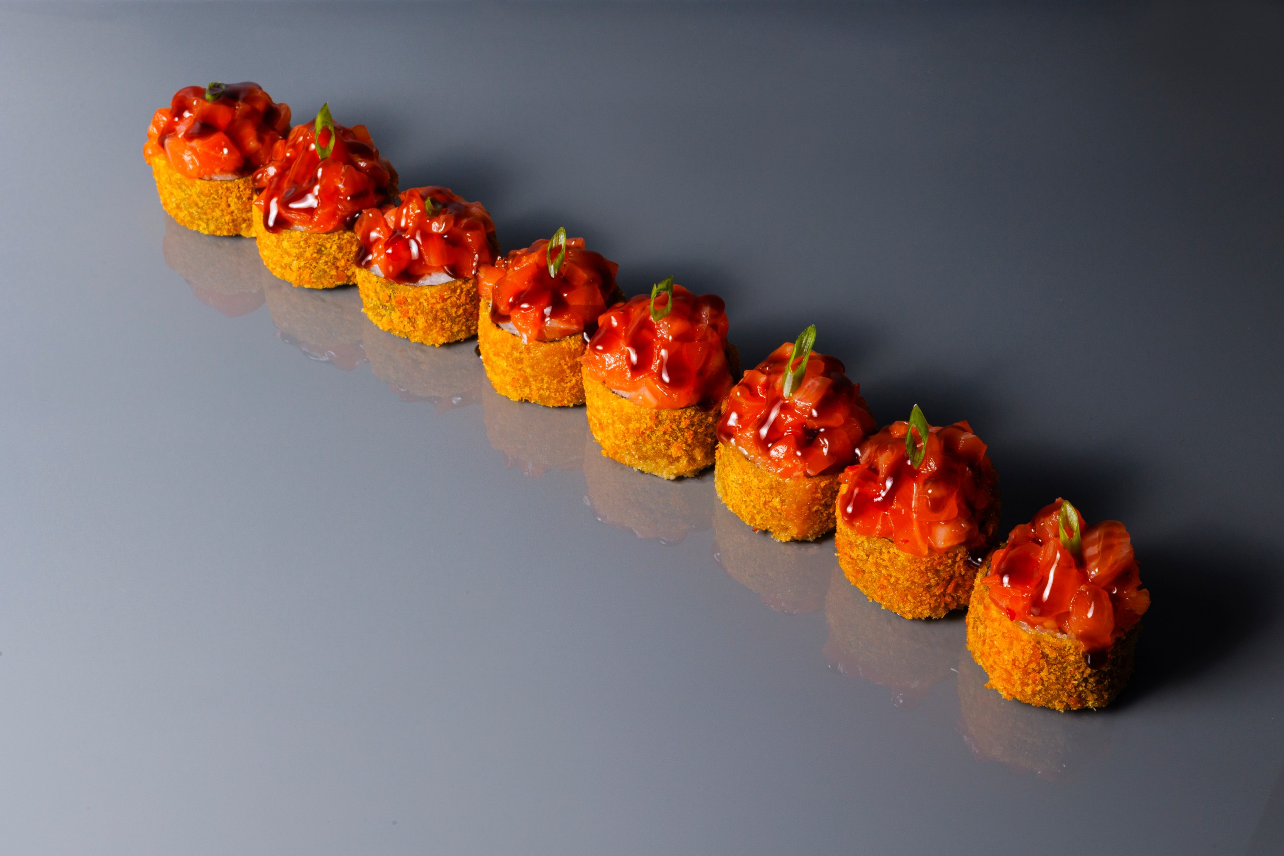 Состав: рис для суши, сыр творожный, темпурный кляр, крабовая палочка, лосось слабосолёный, унаги, лук зелёный.