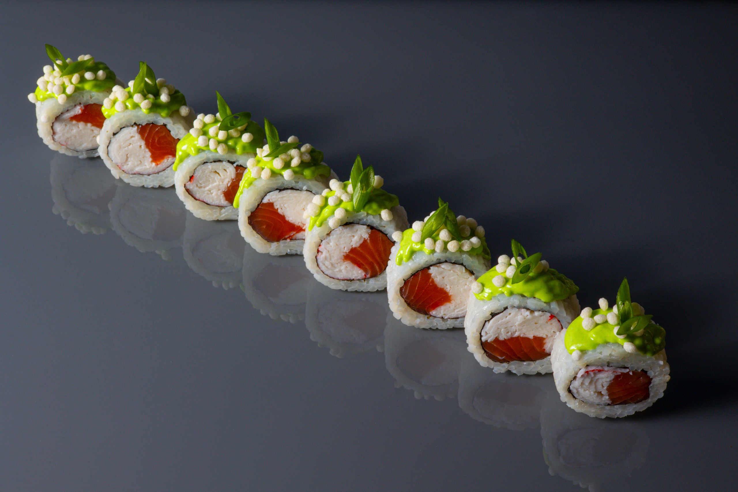 Состав: Рис для суши, хрустящие шарики, соус васаби, лук зелёный, нори, лосось слабосолёный, сыр творожный, крабовая палочка.