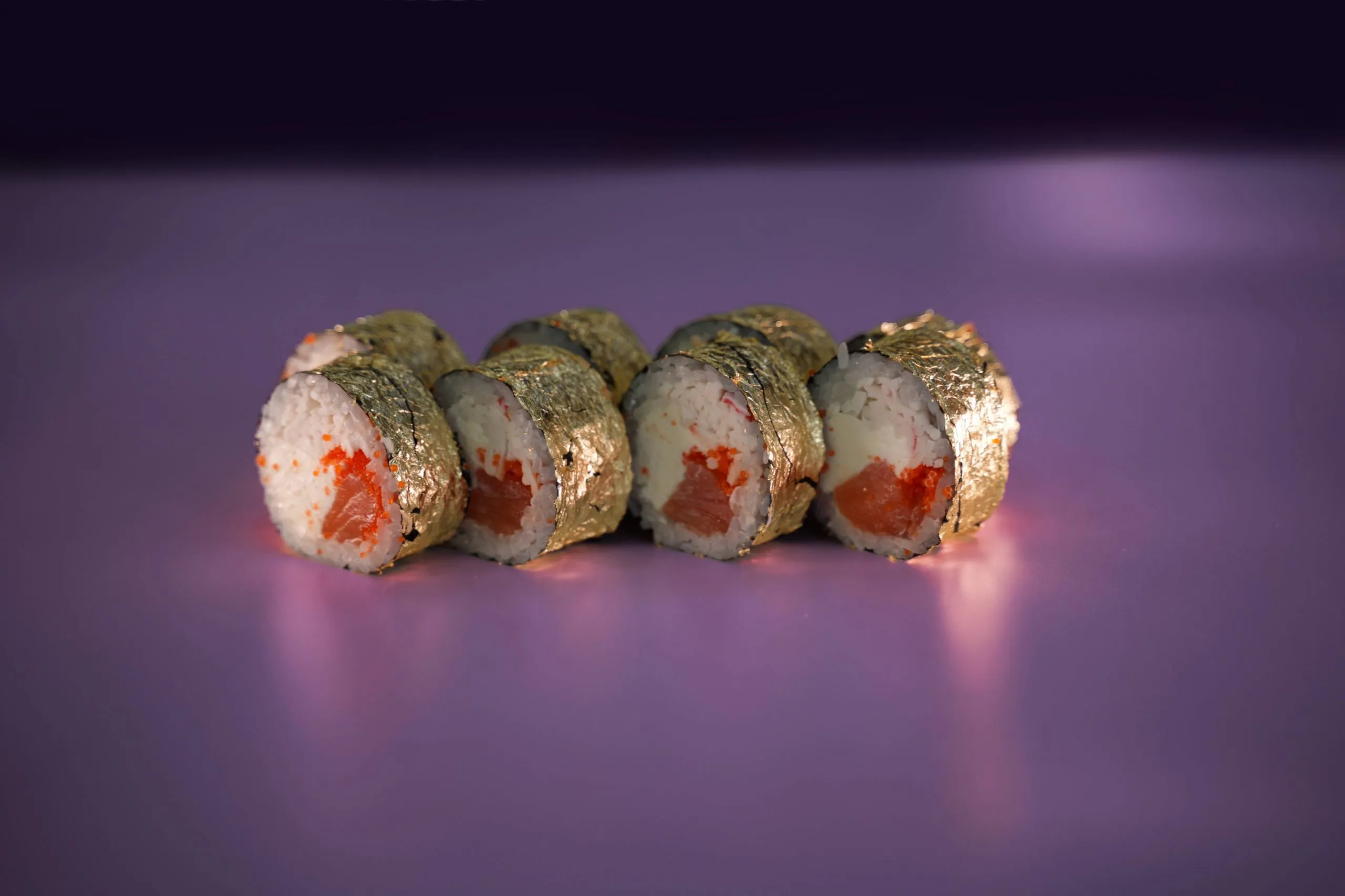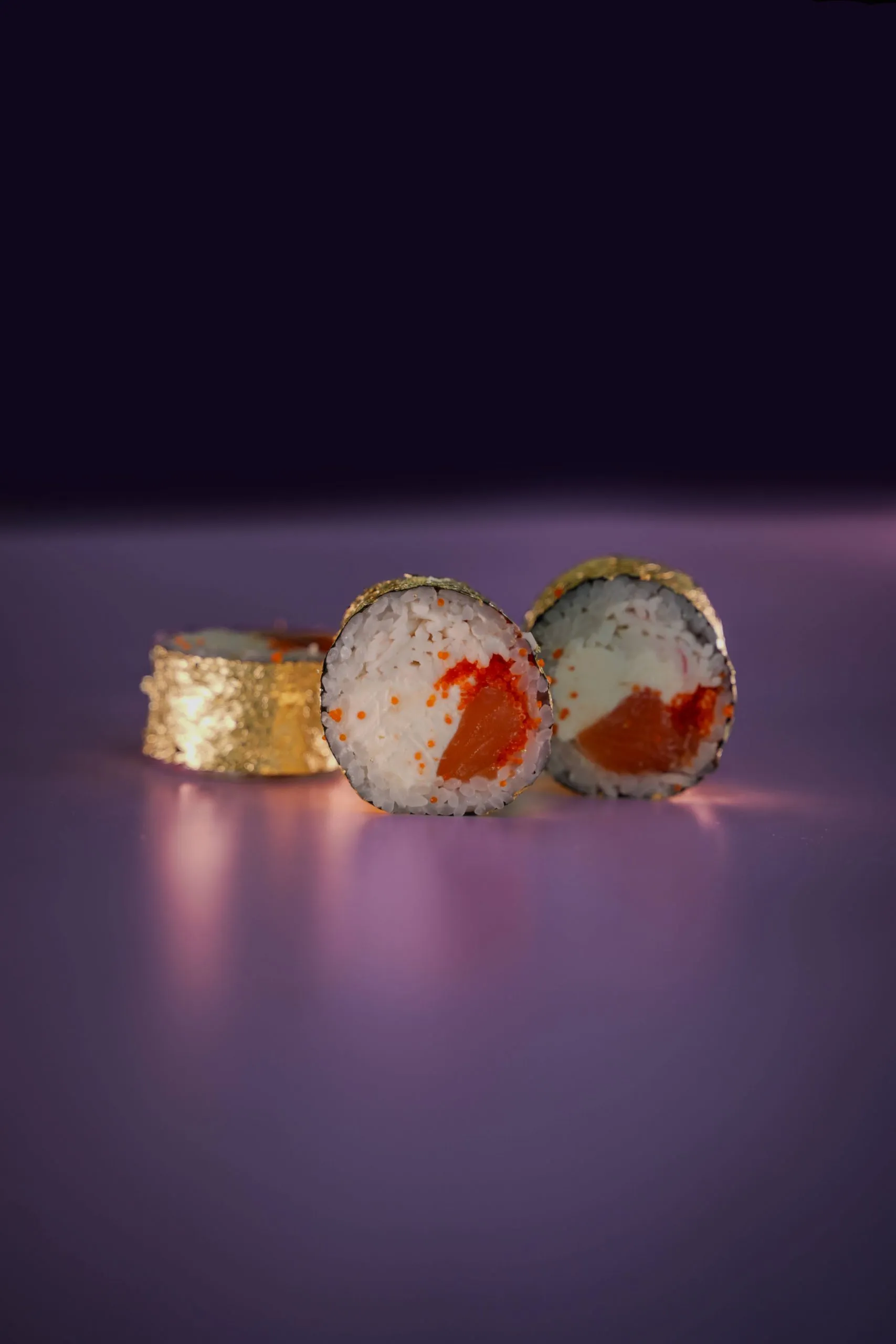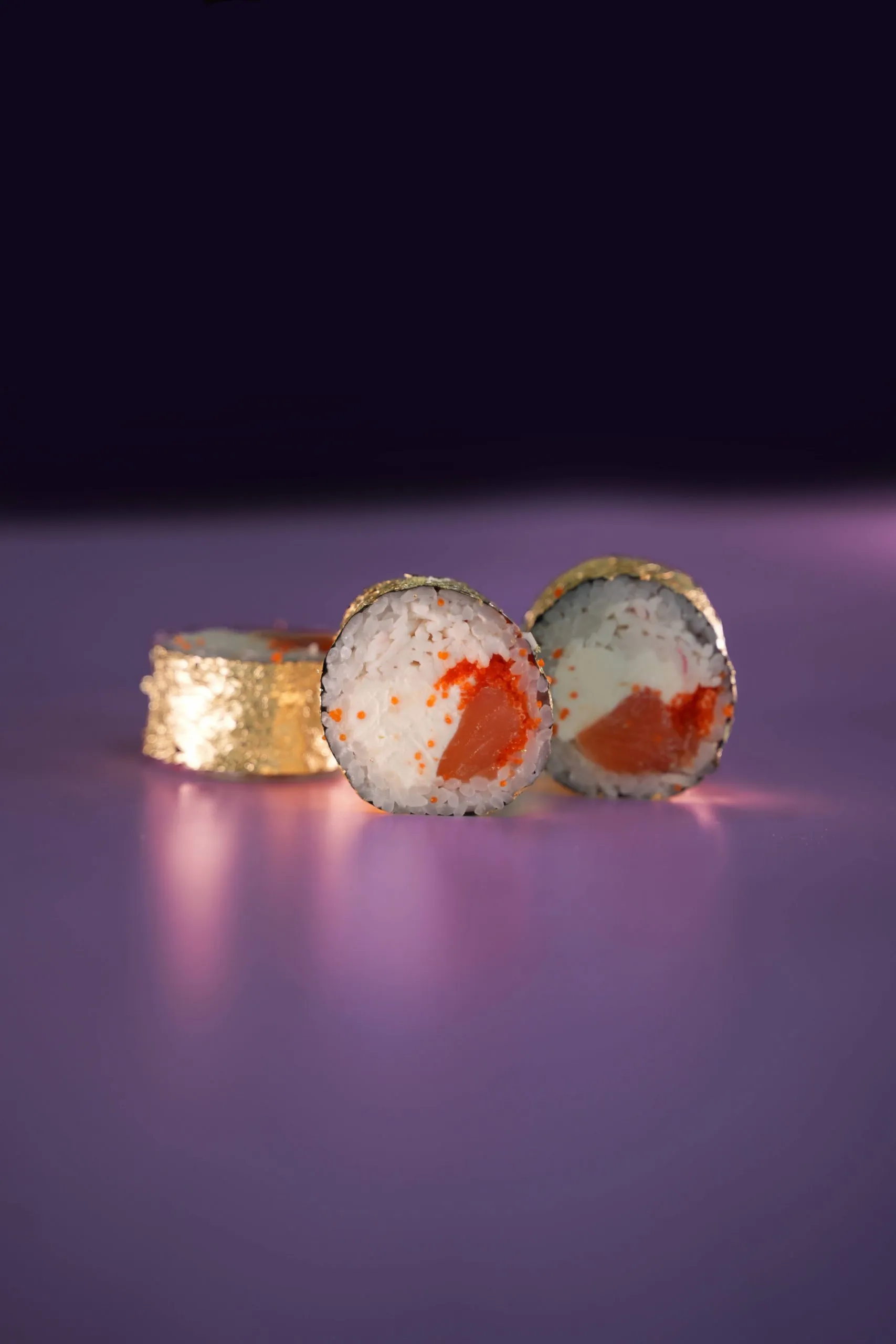 Состав: рис, нори, лосось, снежный краб, икра тобико, творожный сыр